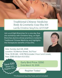 This two-part workshop qualifies for 13 CEUs in total, with 6.5 CEUs granted for each individual workshop. Both workshops are held in-person at Eight Branches College of Eastern Medicine located at 112 Merton Street, 3rd Floor (Room D), Toronto, Ontario, M4S 2Z8.